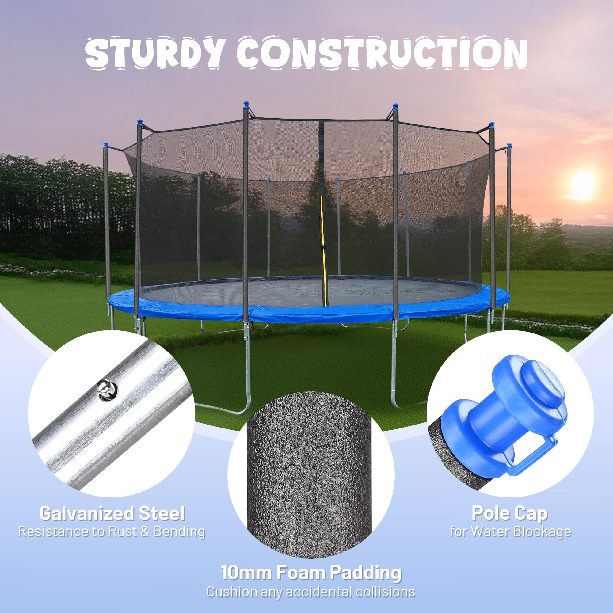 - Complete Hardware for Installation - Includes 2 kinds of installation hardware for different brand poles, you can assemble poles with U-shaped clamps on trampoline frame legs with no bolt holes, or secure poles with screw bolts to trampoline frame legs with bolt holes