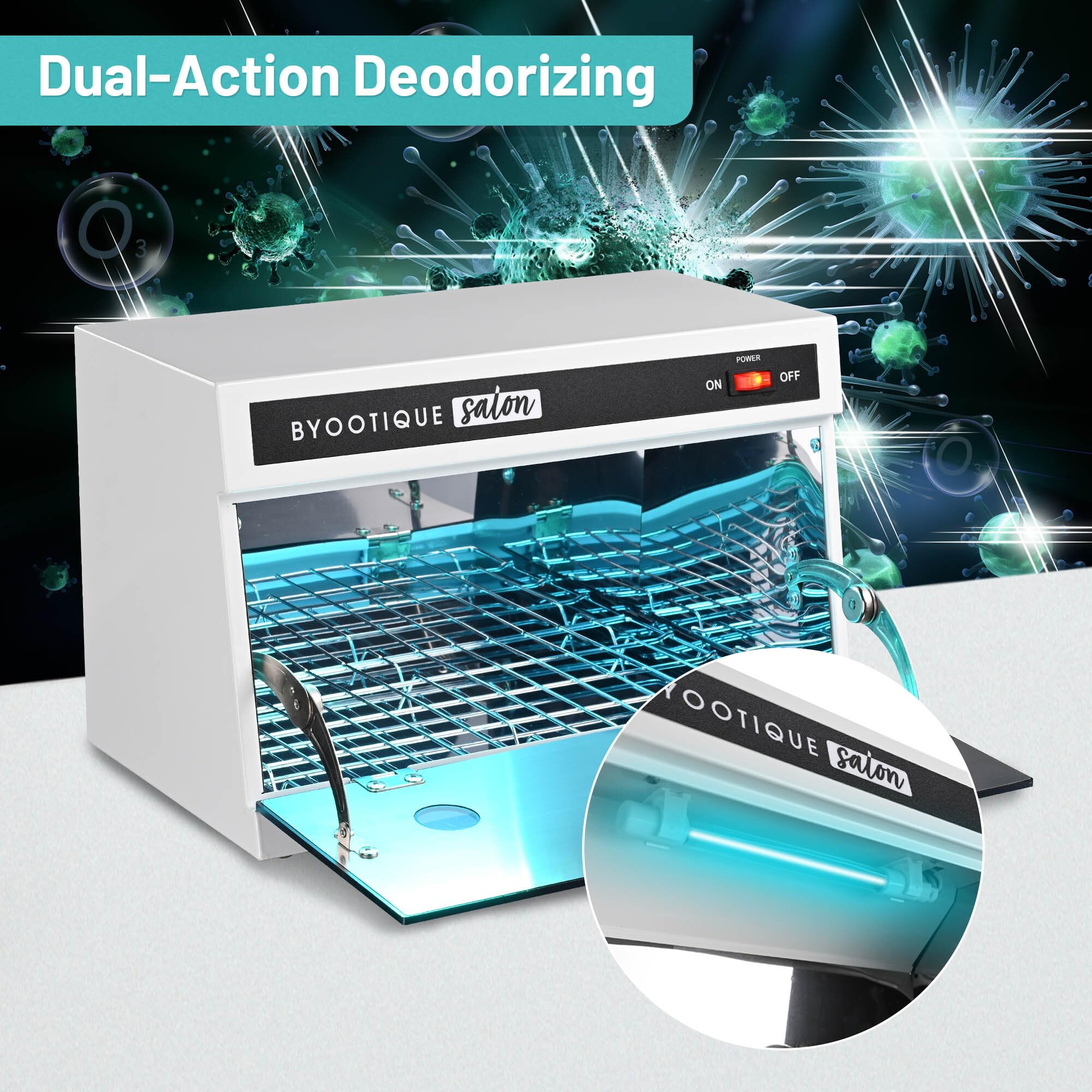 - [Compact Design & Versatile Usages]: Features compact design measuring 14 9/16" x 8" x 9 5/8" for easily fitting in any desktop, suitable for disinfecting tools or personal belongings at home, or for small businesses such as nail studios, beauty salons, barber shops;Certificate No. 103353-CHN-1