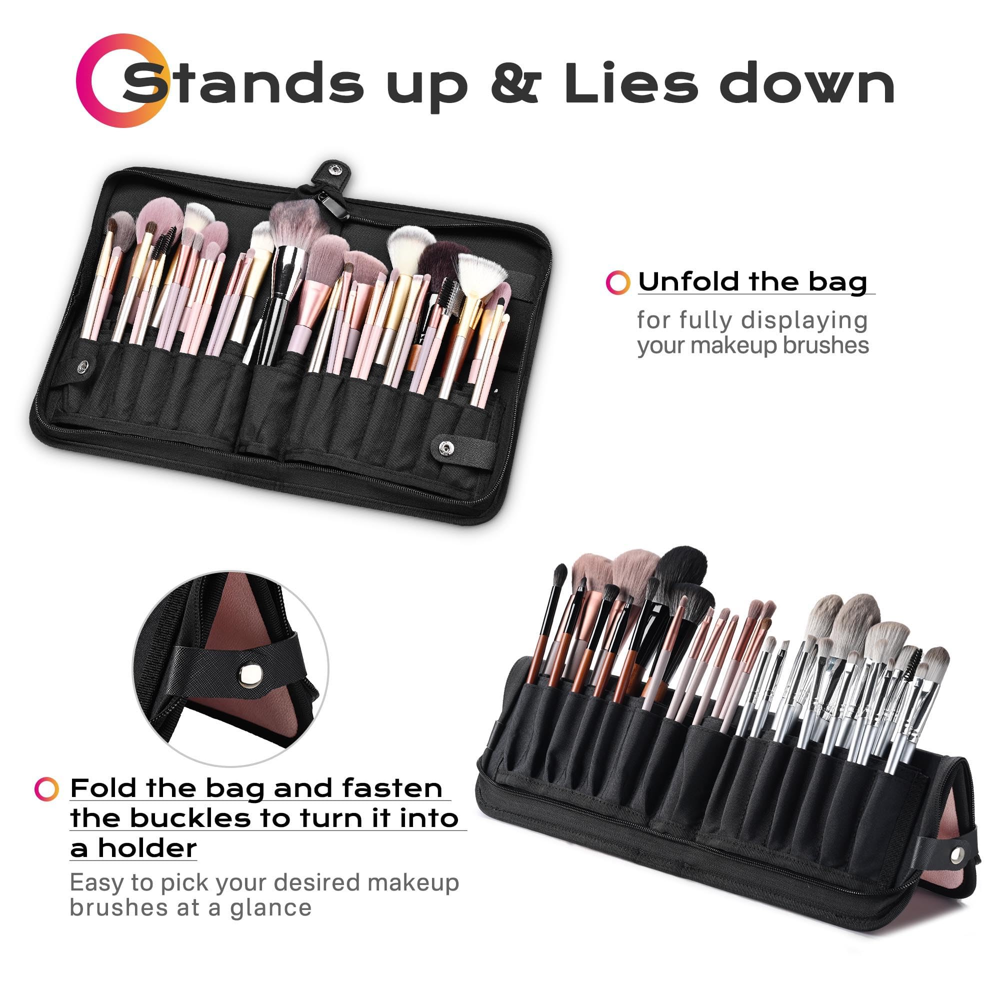 - Upright & Tiled Positioning - Effortlessly access your brushes with the innovative upright or tiled positioning. Simply unfold the bag for full display, or buckle the sides to create a convenient upright holder, keeping your brushes at your fingertips